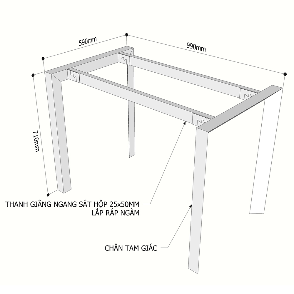 - Chân bàn được làm bằng sắt TAM GIÁC 55X55X78mm (sắt tam giác đều), rất cứng cáp, chịu lực tốt, có tuổi thọ và độ bền cao.