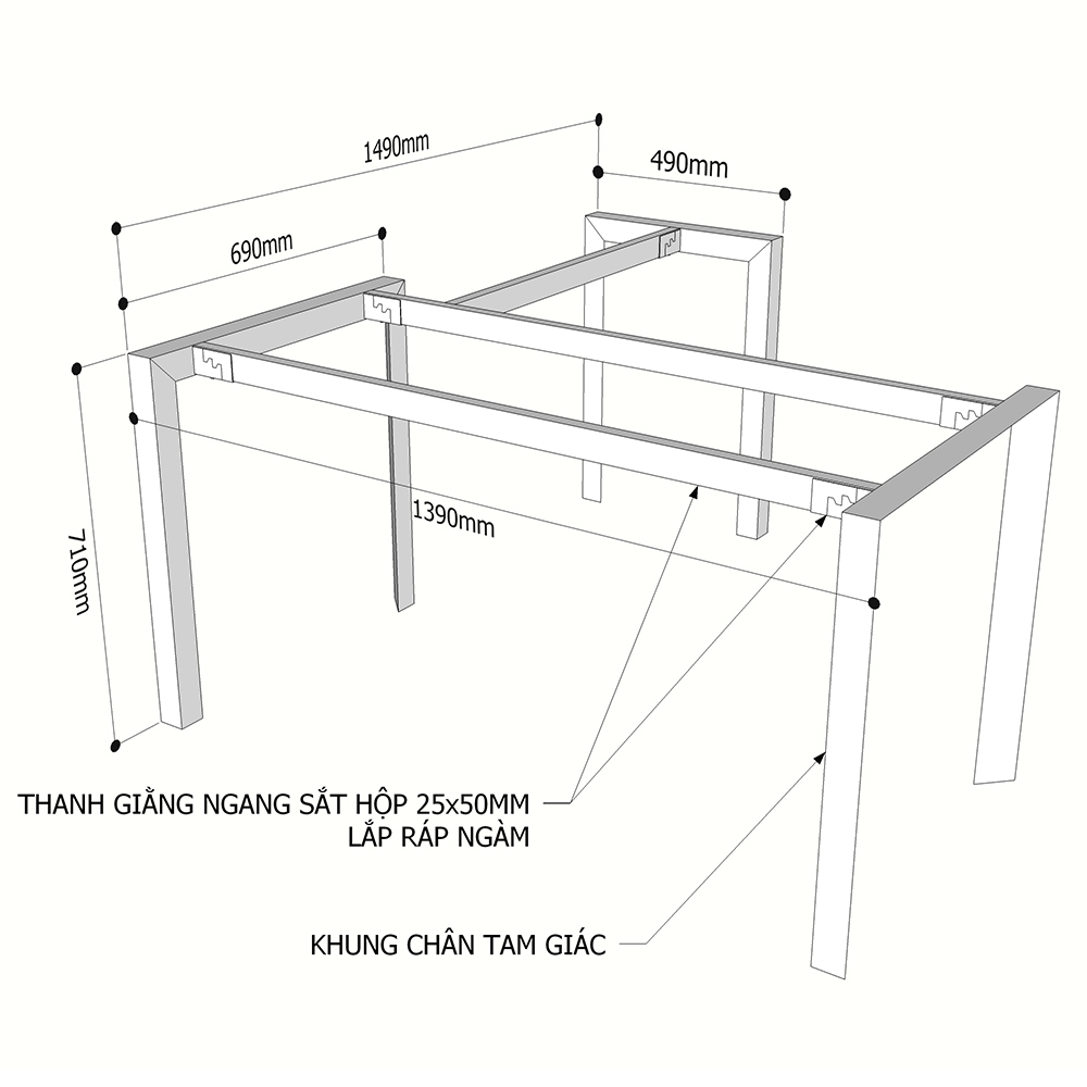 - Chân bàn được làm bằng sắt TAM GIÁC 55X55X78mm (sắt tam giác đều), rất cứng cáp, chịu lực tốt, có tuổi thọ và độ bền cao.