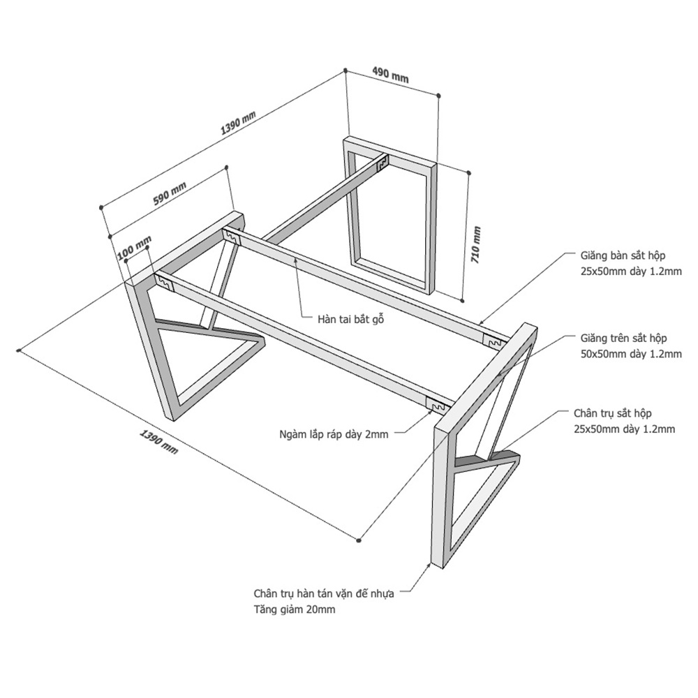 - Chân bàn được làm bằng sắt hộp 25x50cm, loại dày 1,2mm rất cứng cáp, chịu lực tốt, có tuổi thọ và độ bền cao.
