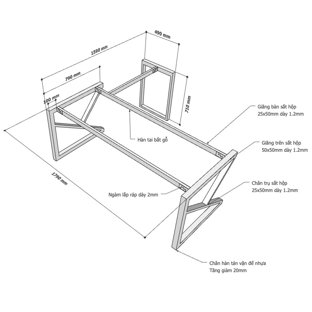 - Chân bàn được làm bằng sắt hộp 25x50cm, loại dày 1,2mm rất cứng cáp, chịu lực tốt, có tuổi thọ và độ bền cao.