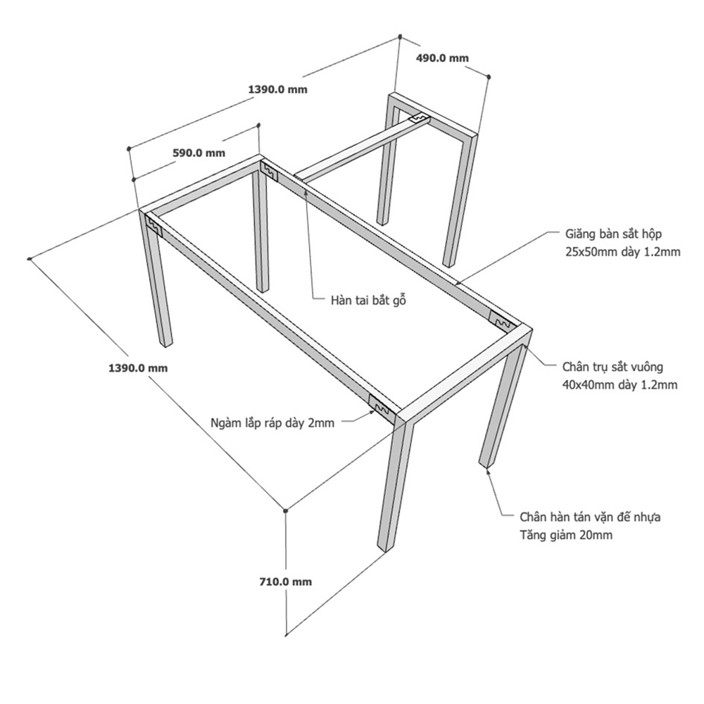 - Chân bàn được làm bằng sắt hộp 40x40mm, loại dày 1,2mm rất cứng cáp, chịu lực tốt, có tuổi thọ và độ bền cao.