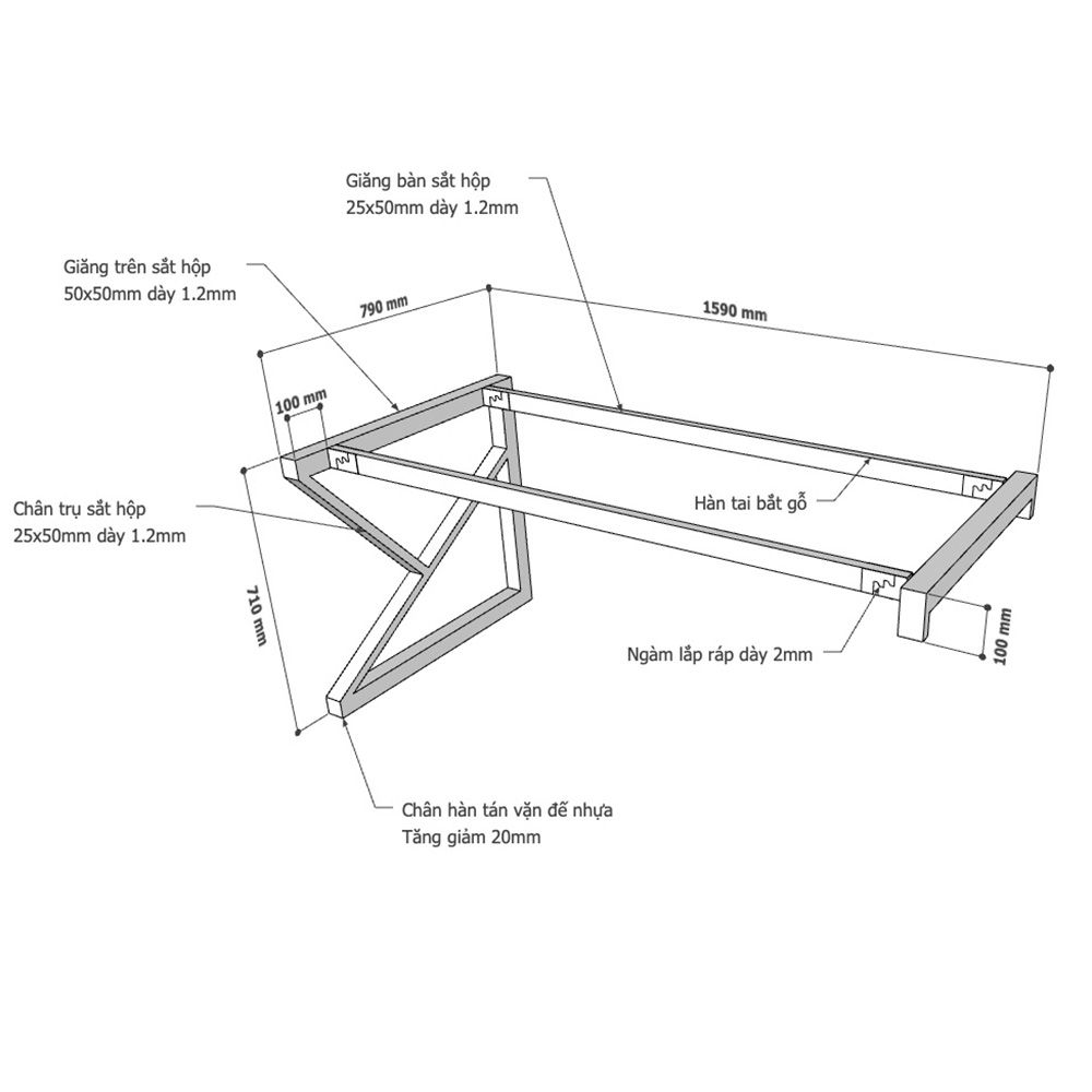 - Chân bàn được làm bằng sắt hộp 25x50cm, loại dày 1,2mm rất cứng cáp, chịu lực tốt, có tuổi thọ và độ bền cao.