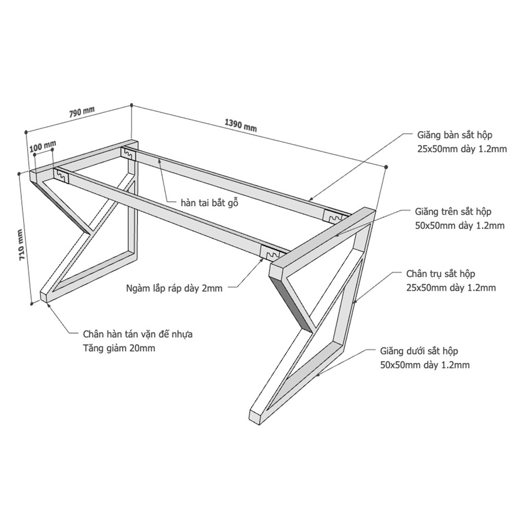 - Chân bàn được làm bằng sắt hộp 25x50cm, loại dày 1,2mm rất cứng cáp, chịu lực tốt, có tuổi thọ và độ bền cao.