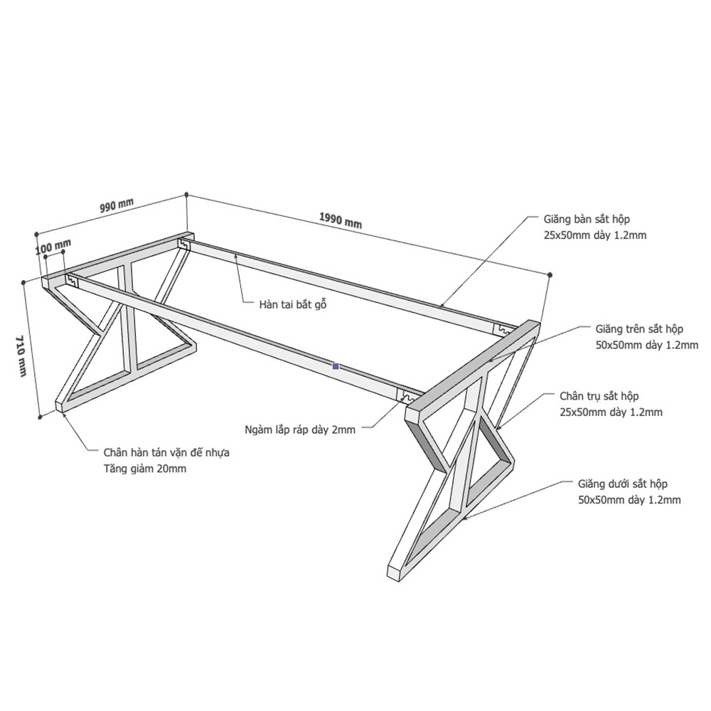 - Chân bàn được làm bằng sắt hộp 25x50cm, loại dày 1,2mm rất cứng cáp, chịu lực tốt, có tuổi thọ và độ bền cao.