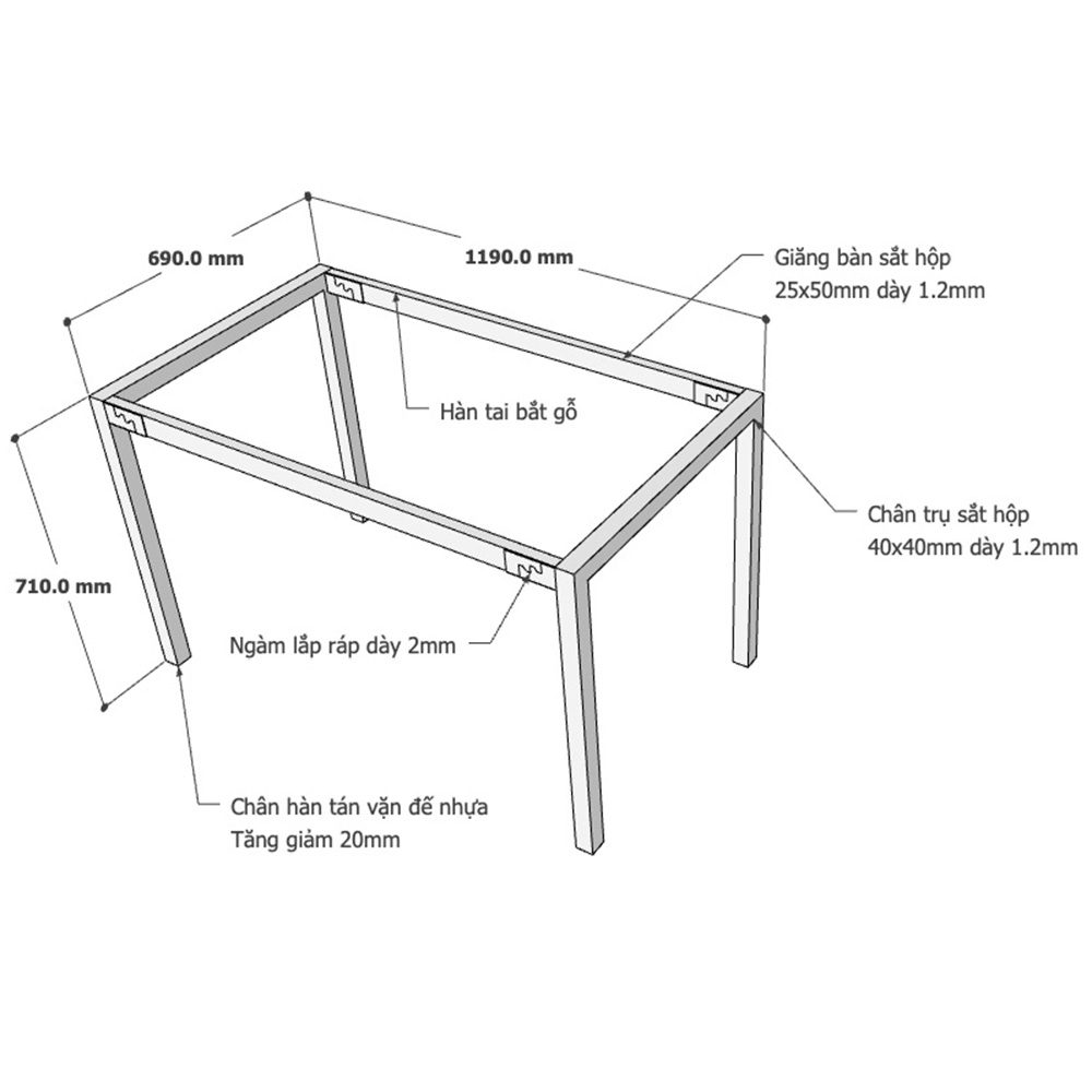 - Chân bàn được làm bằng sắt hộp 40x40mm, loại dày 1,2mm rất cứng cáp, chịu lực tốt, có tuổi thọ và độ bền cao.