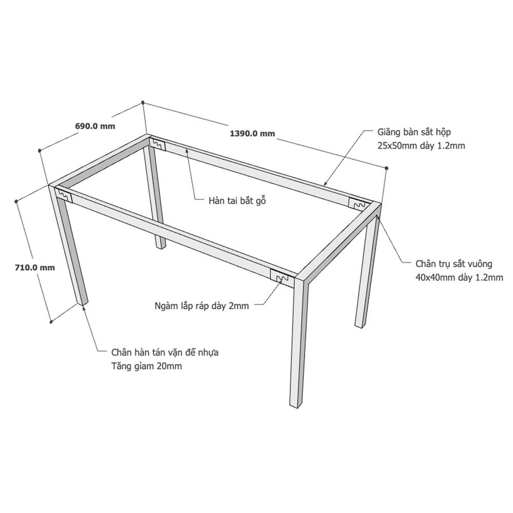- Chân bàn được làm bằng sắt hộp 40x40mm, loại dày 1,2mm rất cứng cáp, chịu lực tốt, có tuổi thọ và độ bền cao.