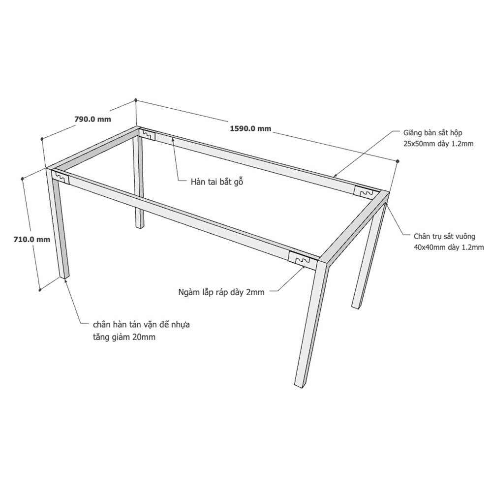 - Chân bàn được làm bằng sắt hộp 40x40mm, loại dày 1,2mm rất cứng cáp, chịu lực tốt, có tuổi thọ và độ bền cao.