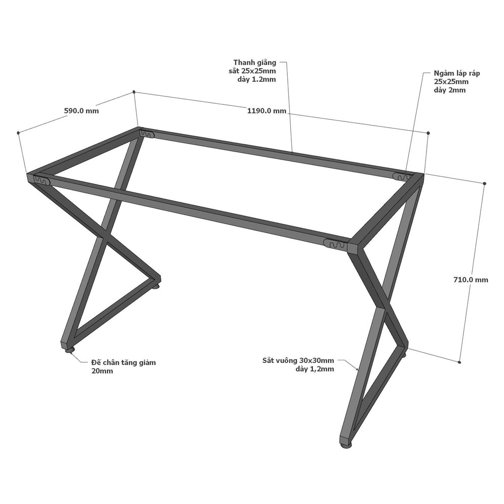 - Chất liệu: chân bàn sắt vuông 30x30mm loại dày 1.2mm, giăng bàn sắt 25x25mm chắc chắn.